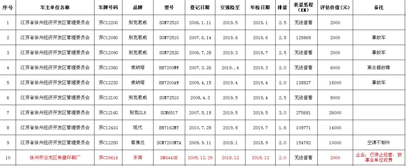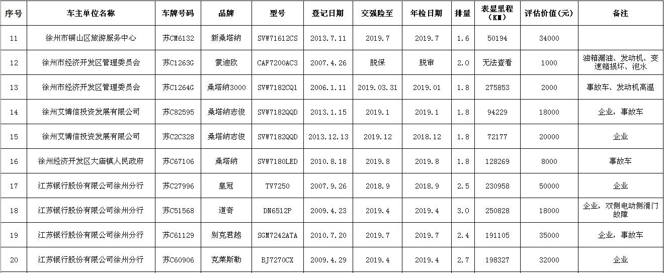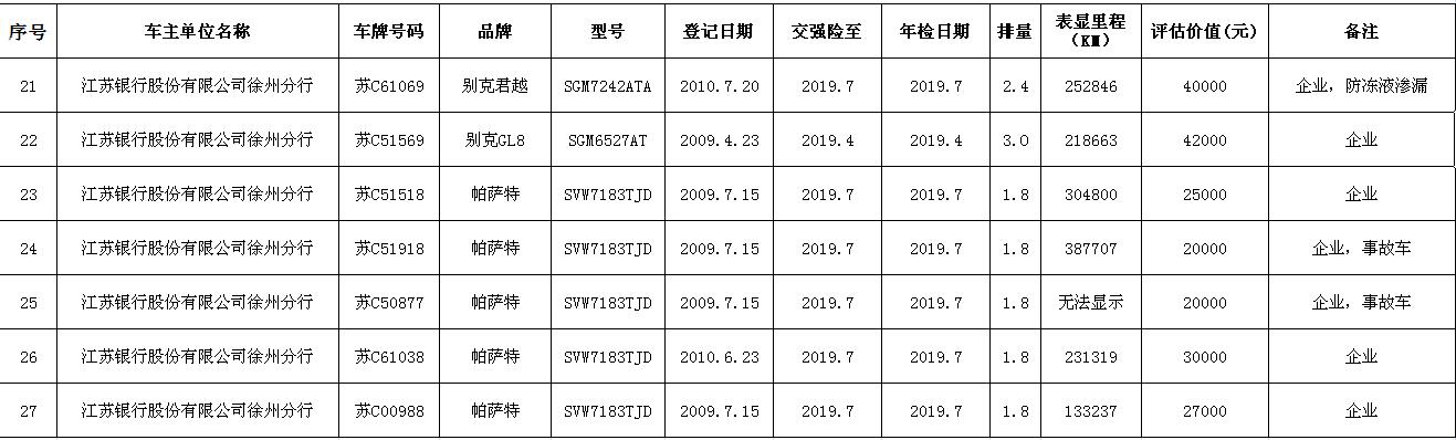 關(guān)注微信公眾號(hào)我公司受委托,定于2018年9月14日10時(shí)在中山南路55號(hào)三樓本公司拍賣廳公開拍賣:江蘇銀行股份有限公司徐州分行、徐州經(jīng)濟(jì)技術(shù)開發(fā)區(qū)、銅山區(qū)、云龍區(qū)公務(wù)車輛二十余輛。主要車型有帕薩特、皇冠、道奇、別克、克萊斯勒等。
