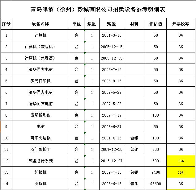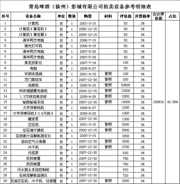 關(guān)注微信公眾號(hào)受委托,我公司定于2018年 9月28日10:00通過(guò)中國(guó)拍賣(mài)行業(yè)協(xié)會(huì)網(wǎng)絡(luò)拍賣(mài)平臺(tái)以網(wǎng)絡(luò)競(jìng)價(jià)的方式公開(kāi)拍賣(mài):青島啤酒(徐州)彭城有限公司廢舊設(shè)備一批,主要包括:洗瓶機(jī)、灌酒壓蓋機(jī)、殺菌機(jī)、包裝機(jī)、輸瓶輸箱系統(tǒng)、辦公設(shè)備等。