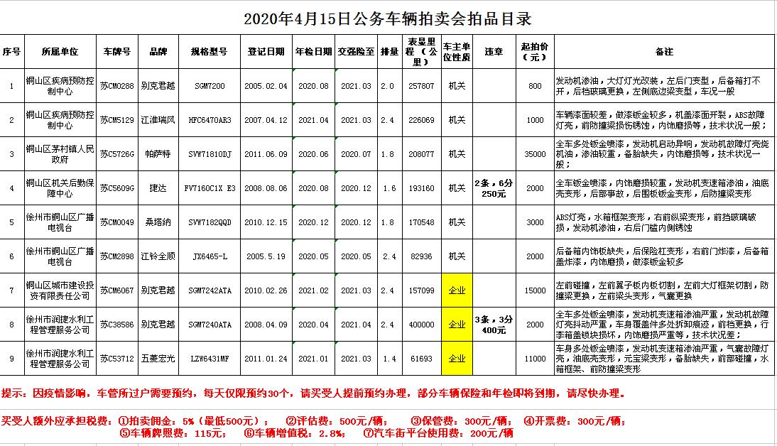 關(guān)注微信公眾號受委托,我公司定于2020年4月15日13:30時(shí)在徐州市銀地二手車交易市場四樓東南拍賣大廳通過現(xiàn)場和汽車街網(wǎng)絡(luò)拍賣平臺同步進(jìn)行的方式公開拍賣以下車輛:①05年蘇CM0288君越;②07年蘇CM5129江淮瑞風(fēng);③11年蘇C5726G帕薩特;④10年蘇CM6067君越;⑤08年蘇C38586君越;⑥11年蘇C53712五菱宏光;⑦08年蘇C5609G捷達(dá);⑧10年蘇CM0049桑塔納;⑨05年蘇CM2898江鈴全順。