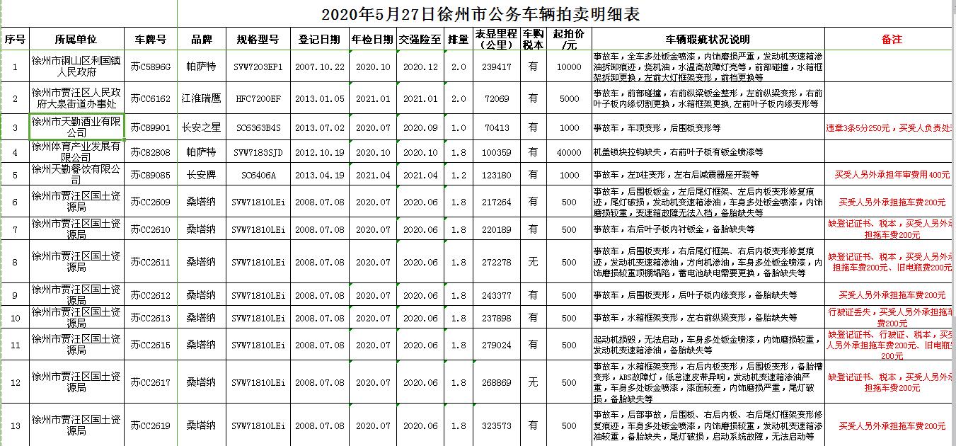 關(guān)注微信公眾號受委托,我公司定于2020年5月27日13:00時(shí)在徐州市銀地二手車交易市場四樓東南拍賣大廳通過現(xiàn)場和汽車街網(wǎng)絡(luò)拍賣平臺同步進(jìn)行的方式公開拍賣以下公務(wù)車輛: