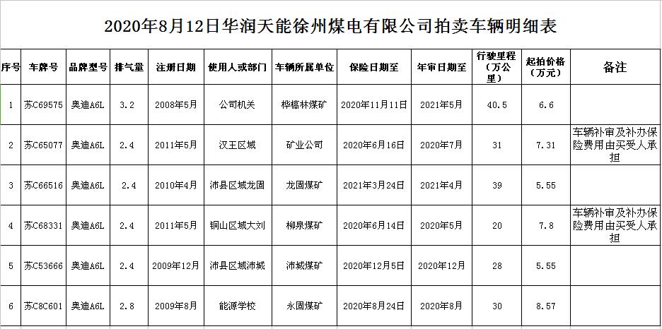 關(guān)注微信公眾號(hào)受委托,我公司定于2020年8月12日14:00時(shí)通過(guò)中拍平臺(tái)和現(xiàn)場(chǎng)結(jié)合方式公開(kāi)拍賣(mài):華潤(rùn)天能徐州煤電有限公司奧迪公務(wù)車(chē)6輛。
