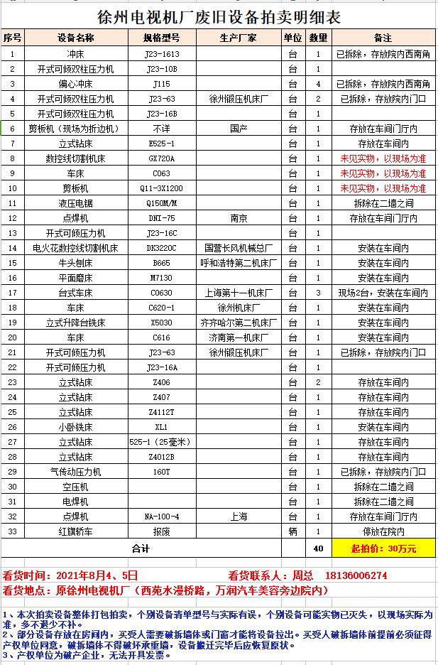 關(guān)注微信公眾號(hào)我公司受委托,定于2021年8月6日上午10時(shí)(延時(shí)除外)在中拍平臺(tái)公開(kāi)拍賣(mài):徐州電視機(jī)廠(chǎng)廢舊設(shè)備一批。主要包含:沖床、壓力機(jī)、折邊機(jī)、鉆床、機(jī)床、車(chē)床、刨床、磨床、銑床等、空壓機(jī)、電焊機(jī)等。