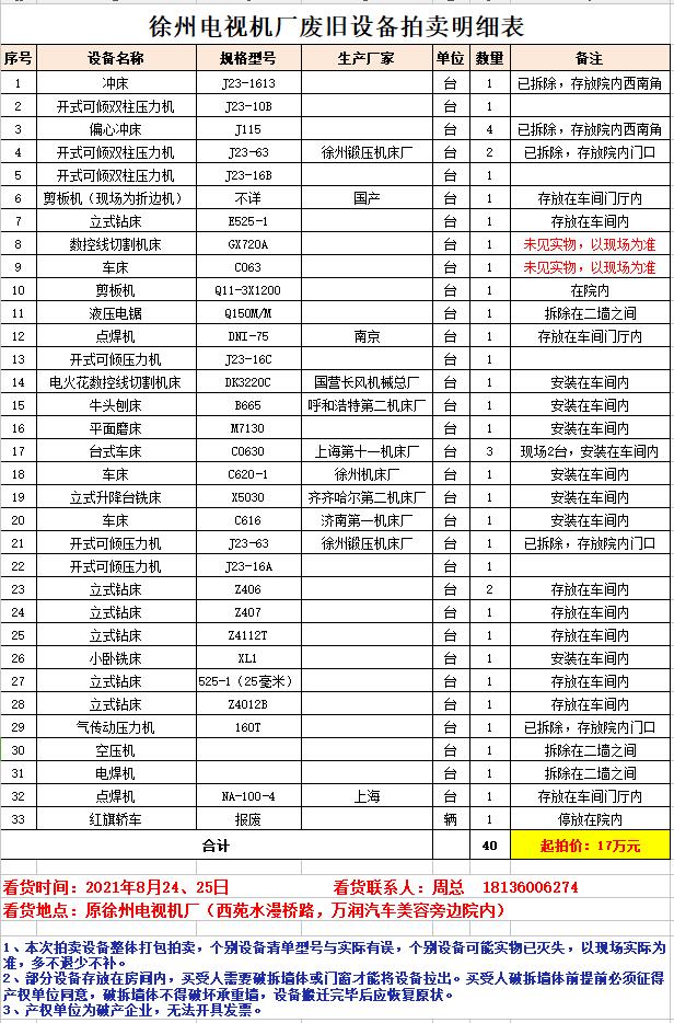 1、徐州電視機(jī)廠廢舊設(shè)備一批。包含:沖床、壓力機(jī)、折邊機(jī)、鉆床、機(jī)床、車床、刨床、磨床、銑床等、空壓機(jī)、電焊機(jī)等。(競買人須為具有再生資源回收資質(zhì)的企業(yè)法人),拍賣參考價(jià)17萬元。保證金5萬元。